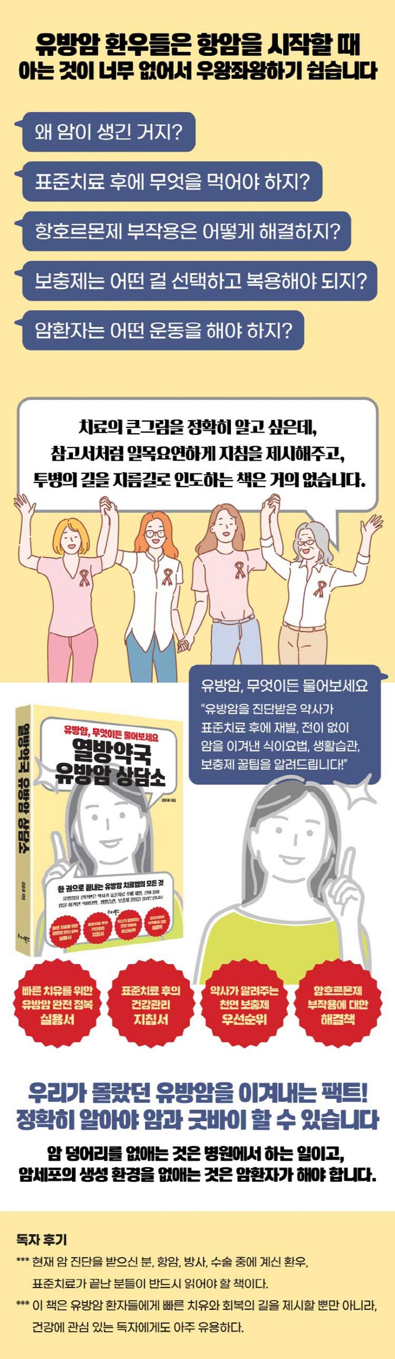 직접 유방암을 겪고, 완치까지 실천한 약사의 경험과 노하우가 고스란히 담겨 있습니다.