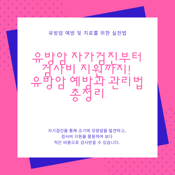유방암은 치료를 위한 정보뿐만 아니라 예방, 관리, 그리고 삶의 질을 높일 수 있는 다양한 지식이 필요합니다. 여기에서는 유방암 자가검진법, 유방암 검사비 지원받는 방법, 그리고 유방암 환자를 위한 식단 가이드에 대해 알아보겠습니다. 유방암을 예방하고 치료 후 삶의 질을 개선하기 위한 정보들이 담겨 있습니다. 유방암에 대한 올바른 이해와 실천을 통해 건강한 삶을 이어가세요!