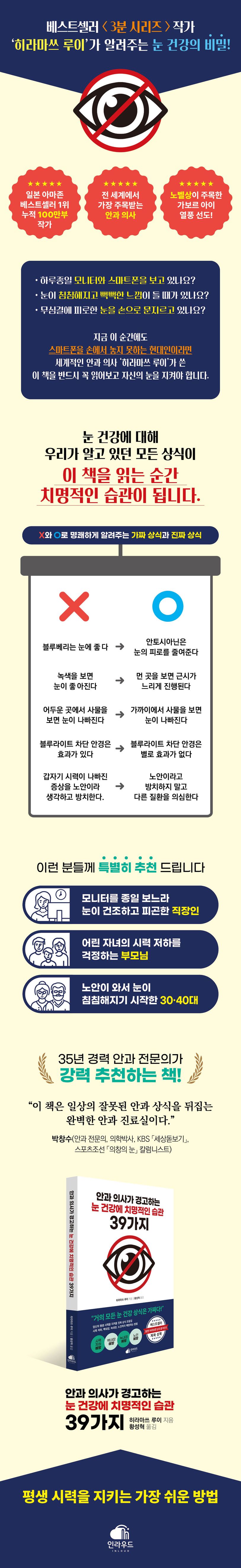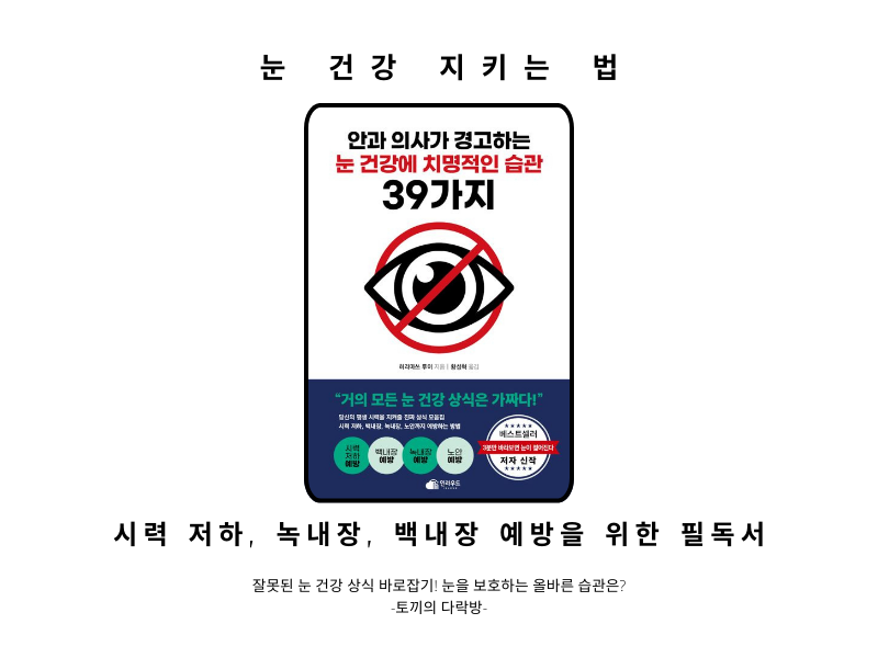 오늘은 ‘안과 의사가 경고하는 눈 건강에 치명적인 습관 39가지’라는 책을 통해 우리가 잘못 알고 있었던 눈 건강 상식과 예방 방법을 살펴보려 합니다. 이 책은 세계적인 안과 전문의인 히라마쓰 루이가 집필한 것으로, 15만 명 이상의 환자를 치료한 경험을 바탕으로 눈 건강에 대한 진짜 정보를 전달하고 있습니다.