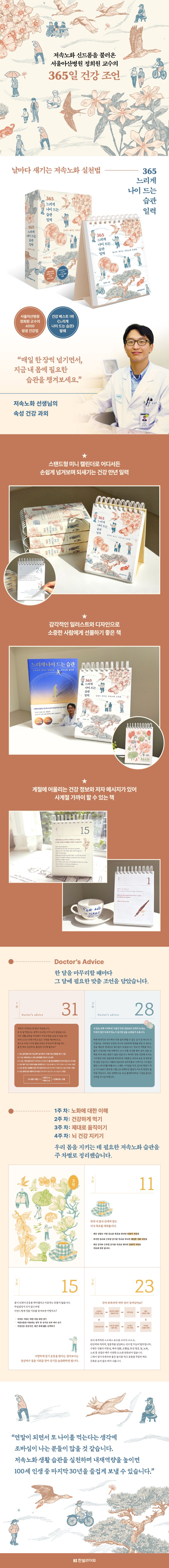 서울아산병원의 정희원 교수는 저속노화(Slow Aging) 개념을 통해 건강한 노화를 실천하는 방법을 연구해왔습니다. 그의 저서 《느리게 나이 드는 습관》은 노화를 늦추는 생활 방식을 소개하며, 이번에 출간된 《365 느리게 나이 드는 습관 일력》은 매일 한 가지씩 실천할 수 있도록 도와주는 건강 지침서입니다.