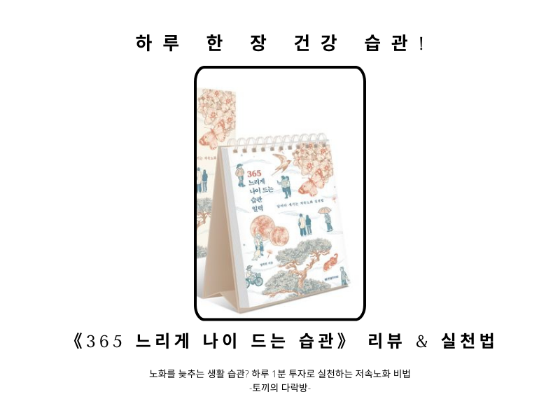 《365 느리게 나이 드는 습관》은 하루 한 장씩 건강한 습관을 만들어가는 책입니다. 한꺼번에 모든 걸 바꾸려 하기보다, 매일 하나씩 작은 변화를 주는 것이 중요합니다.