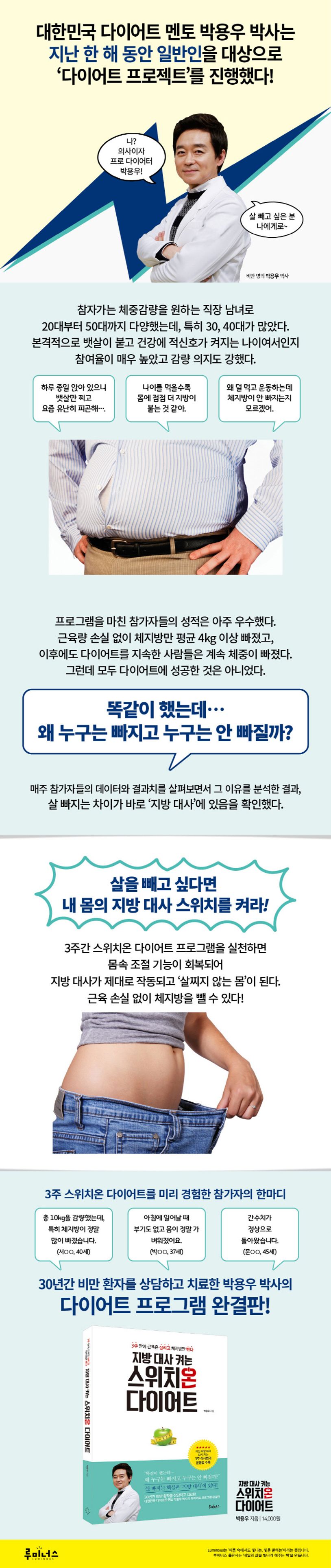 박용우 박사의 《지방 대사 켜는 스위치온 다이어트》는 체중 감량을 넘어서, 체지방만 빼고 건강한 몸을 만들 수 있는 해법을 설명하는 책입니다. 지방 대사를 활성화시키는 식사법과 운동법, 그리고 생체리듬 회복을 통해 우리는 3주 만에 체지방을 효율적으로 줄이고, 살찌지 않는 몸으로 변할 수 있습니다. 이 책은 체중감량을 원하는 사람에게 꼭 필요한, 그리고 평생 건강한 몸을 위한 중요한 지침서가 될 것입니다.