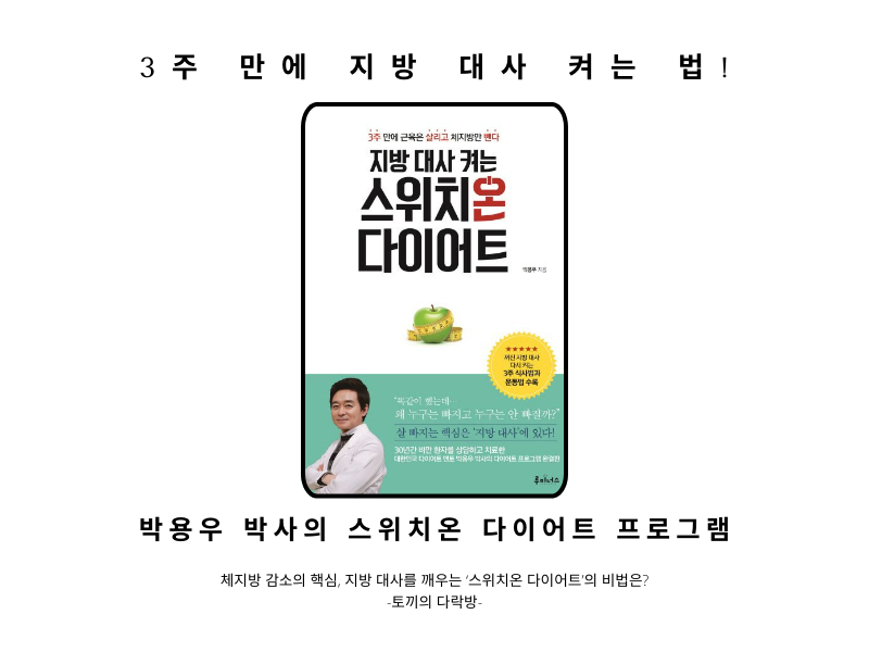 최근 다이어트에 대한 관심이 날로 증가하고 있는 가운데, 체중을 감량하는 것을 넘어서, 어떻게 하면 건강하게 체지방만 줄일 수 있을지에 대한 고민이 커지고 있습니다. 바로 이런 고민을 해결해주는 책이 박용우 박사의 《지방 대사 켜는 스위치온 다이어트》입니다. 이 책은 30년간 비만 환자들을 상담하고 치료해온 박용우 박사가 3주 만에 체지방을 효과적으로 줄이는 방법을 설명합니다. 이제부터 그 핵심적인 내용을 살펴보겠습니다.