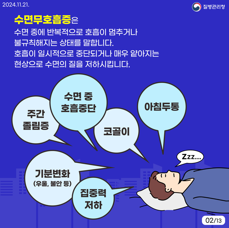 - 수면 중 호흡이 멈추거나 불규칙해지는 상태로, 호흡이 일시적으로 중단되거나 매우 약해지는 현상