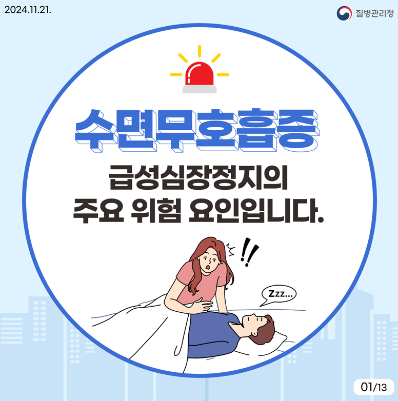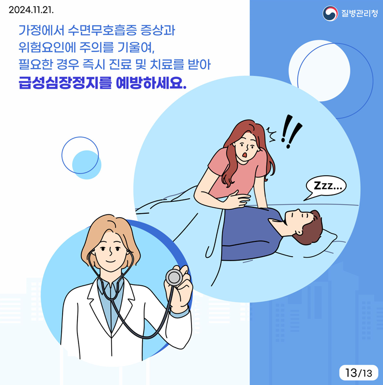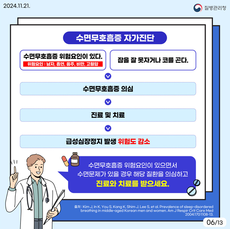 - 수면무호흡 증상 및 위험요인에 주의를 기울이세요.