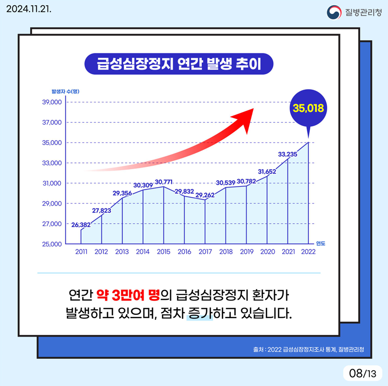 - 증상이 의심되면 진료와 치료를 통해 급성 심장정지 위험도를 낮출 수 있습니다.
