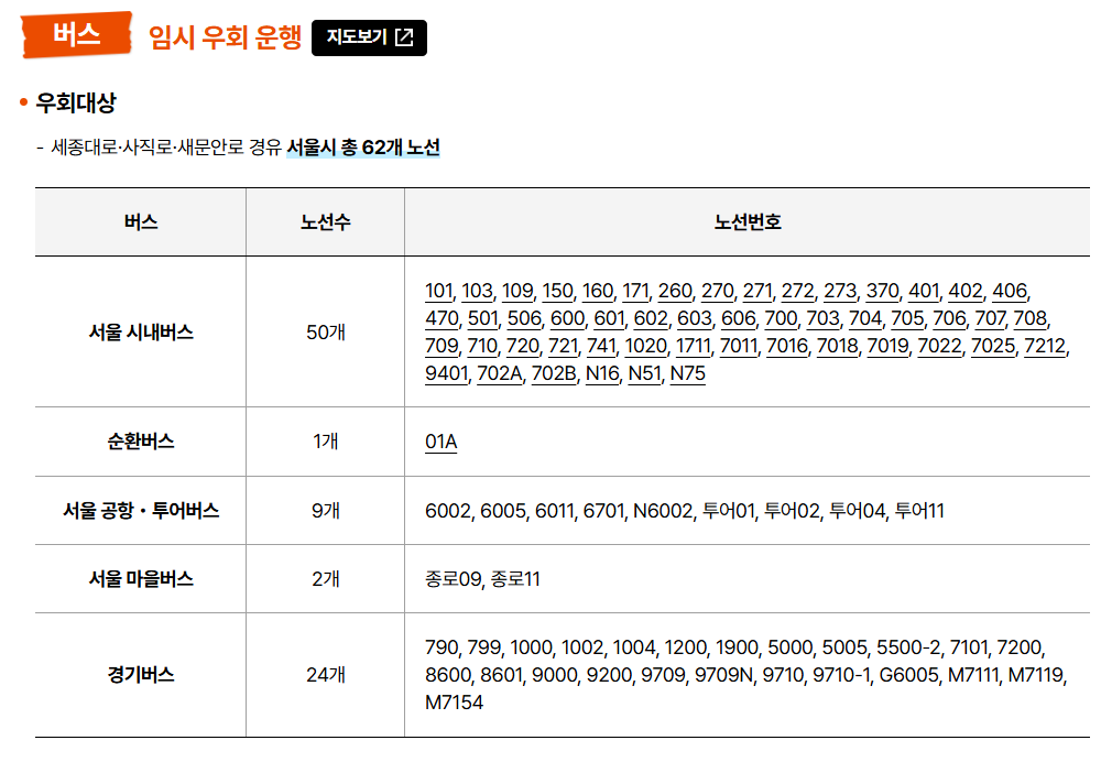 행사 기간 동안 광화문 일대를 지나는 버스 노선이 우회 운행됩니다.