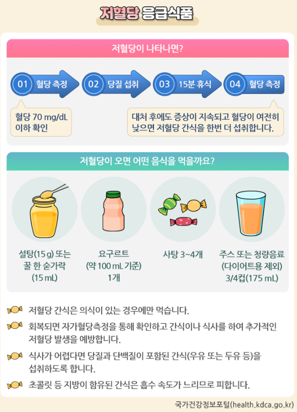 - 혈당이 낮으면 포도당 15~20g 섭취 후 혈당 확인