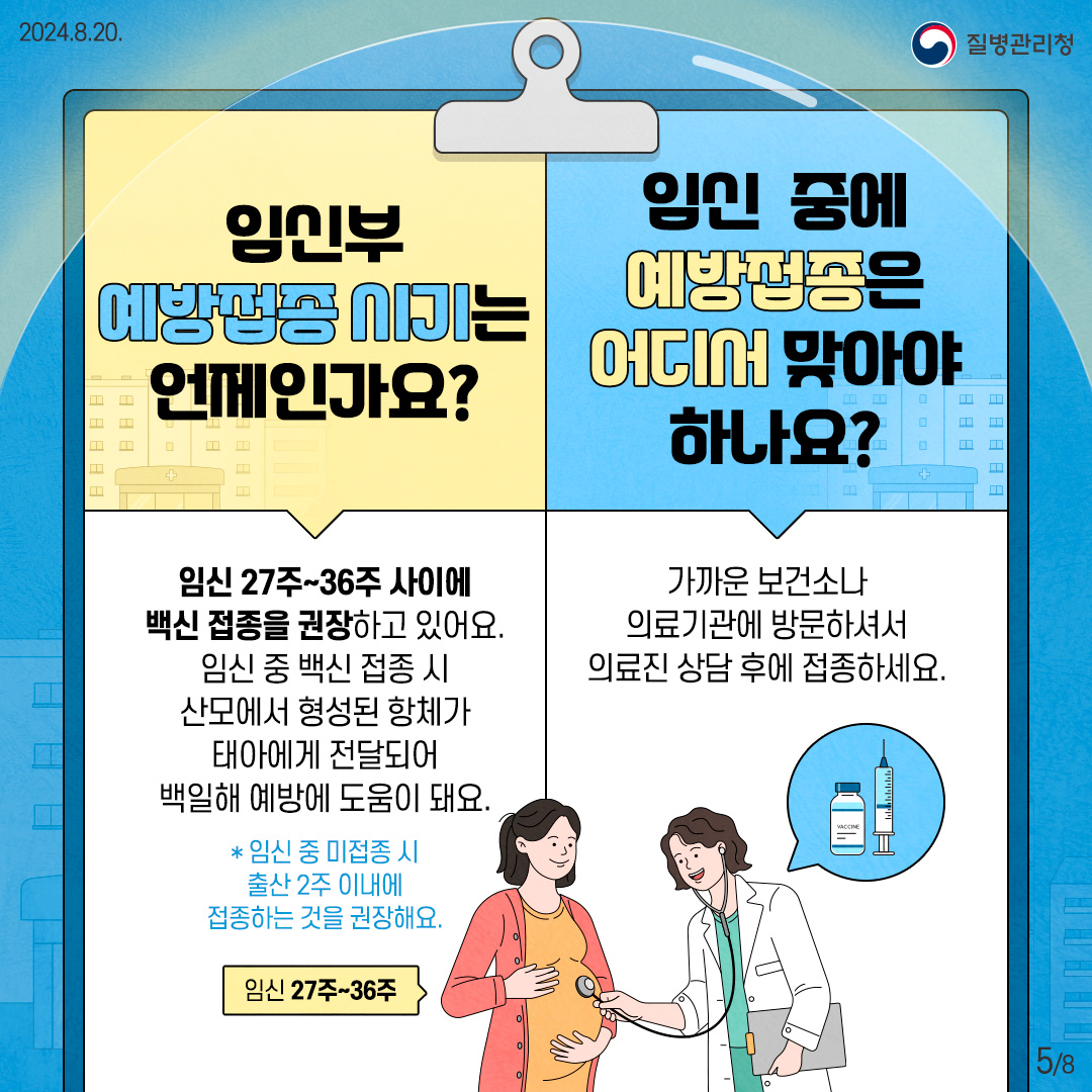 - 임신 27~36주 사이에 예방접종을 맞는 것이 권장됩니다.