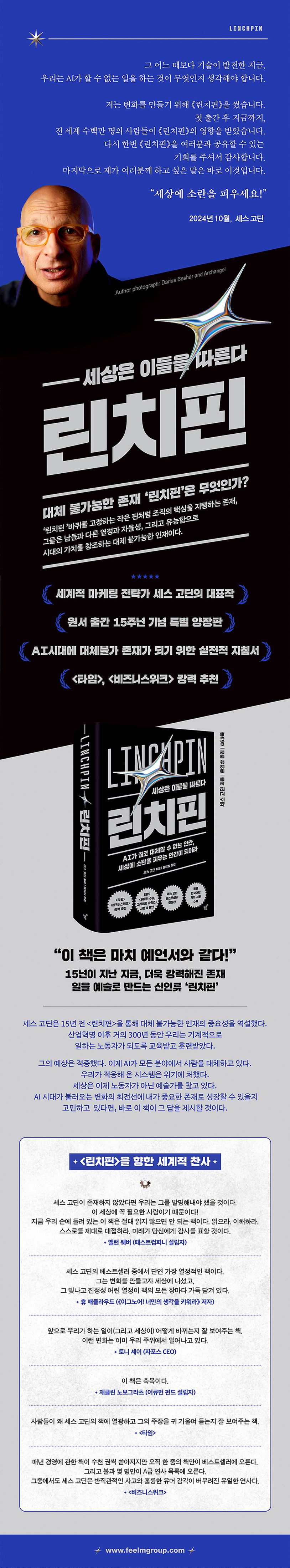 세스 고딘은 이를 '린치핀'의 능력으로 정의합니다. 린치핀은 자신의 고유한 창의성, 열정, 비전으로 조직에 독창적인 가치를 더하고, 그로 인해 누구도 대신할 수 없는 존재가 됩니다. AI와 기계가 할 수 없는 창의적이고 전략적인 사고를 통해 조직과 사회에 큰 변화를 이끌 수 있는 사람이 바로 '린치핀'인 것입니다.