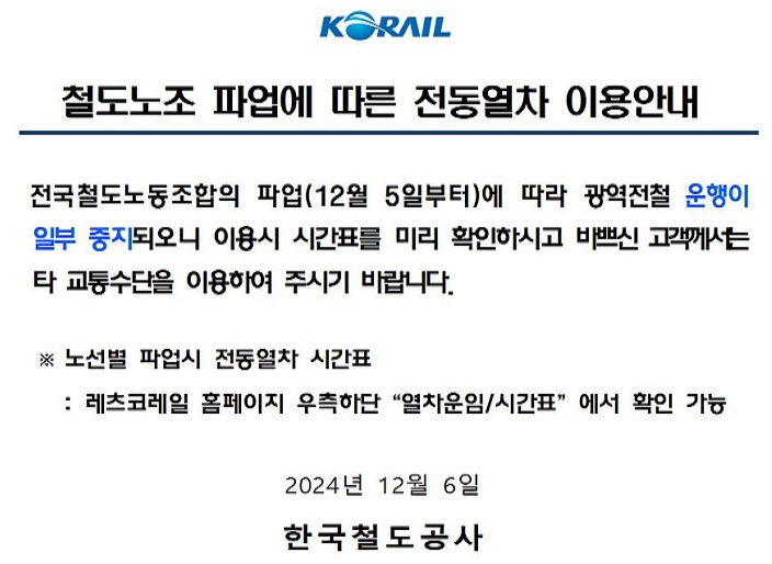 전국철도노동조합의 파업(12월 5일부터)에 따라 광역전철 운행이 일부 중지됩니다. 전동열차를 이용하시는 고객께서는 시간을 미리 확인하시고, 혼잡을 피하기 위해 가능한 다른 교통수단을 이용해 주시기 바랍니다.
