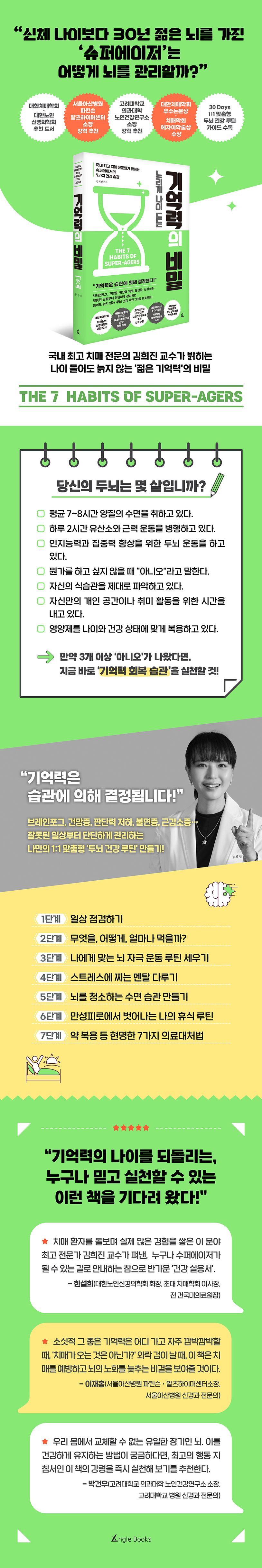 최근 ‘슈퍼에이저’라는 용어가 주목받고 있습니다. 슈퍼에이저는 동년배들보다 훨씬 젊은 뇌를 유지하며 뛰어난 기억력과 인지능력을 자랑하는 사람들을 지칭하는 말입니다. 과연 그들은 어떻게 그들의 뇌 건강을 유지하고, 기억력을 보호하는 습관을 갖게 되었을까요? 김희진 교수의 책 『느리게 나이 드는 기억력의 비밀』은 그 비결을 7가지 습관으로 정리해 설명하고 있습니다. 이 책은 기억력과 뇌 건강을 위한 일상적인 실천을 소개하며, 나이가 들어도 뇌 건강을 관리할 수 있는 방법을 알려줍니다.